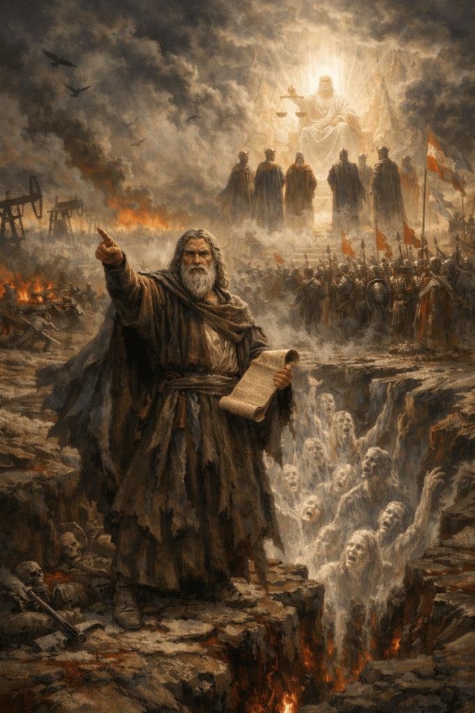 When greed for oil, or thirst for power’s throne, Doth stir the drums and send forth sons to die, Call it not justice in the courts of men— The Judge of all shall hear the blood’s own cry. Hear it rise—not faint, but swelling, A chorus beneath the soil, beneath the stone, beneath the cities’ gleaming towers; Smell it—the sharp and bitter reek of burning fields, Of flesh and metal mingled in the heat of wrath; Taste it—the dust that fills the mouth of nations, Dry and choking with the cost of hidden motives.